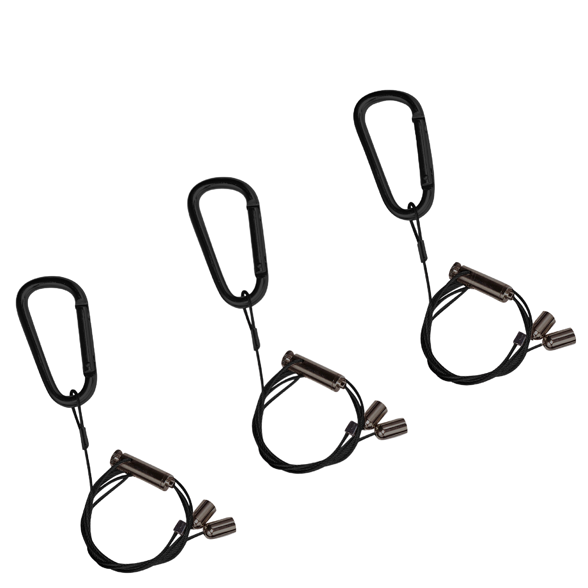 The Meridian hanging wire sets are black coated stainless steel, and adjust from 6" to 9.5 Feet above the light and end at a black carabiner. Excess cable can be trimmed if needed. Sold in sets of 1 or 2.